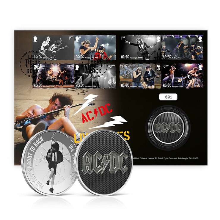 All eight stamps featuring stunning shots of AC/DC in concert are cancelled with a special edition ‘Live Wires’ handstamp and set against an image of Angus Young on stage.
