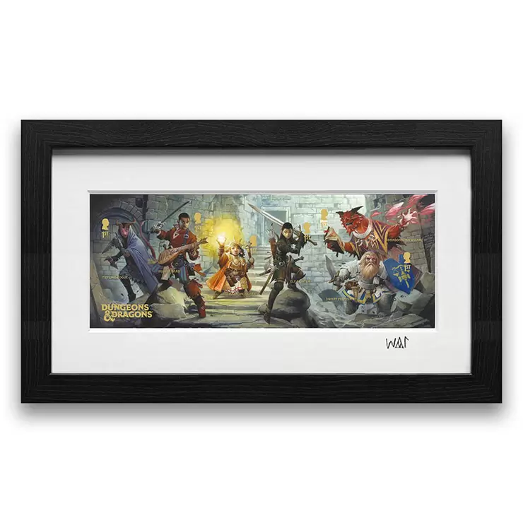 The ultimate souvenir honouring 50 years of magic, myth and monsters. Renowned DUNGEONS & DRAGONS comic artist Wayne Reynolds has signed 200 framed Miniature Sheets featuring the illustrations he created exclusively for this issue. The six First Class Miniature Sheet stamps are mounted and protected in a premium black frame. Strictly limited availability – just 200 frames available worldwide.