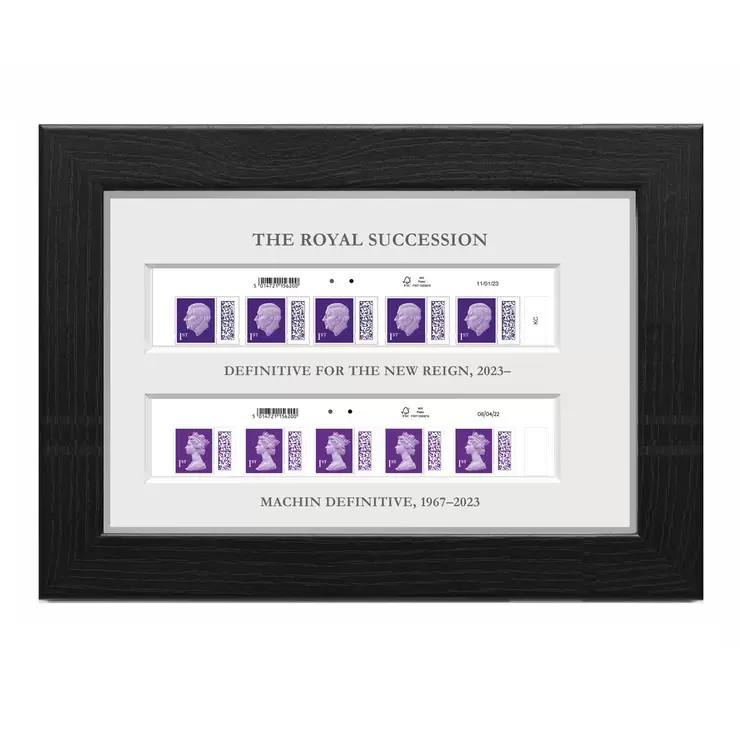 Two stamp sets taken from the final print run of Queen Elizabeth II stamps and the first print run of King Charles III stamps Professionally mounted and framed. A unique philatelic souvenir to display and treasure, marking the historic change of monarch on British postage stamps.