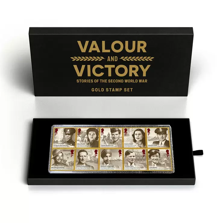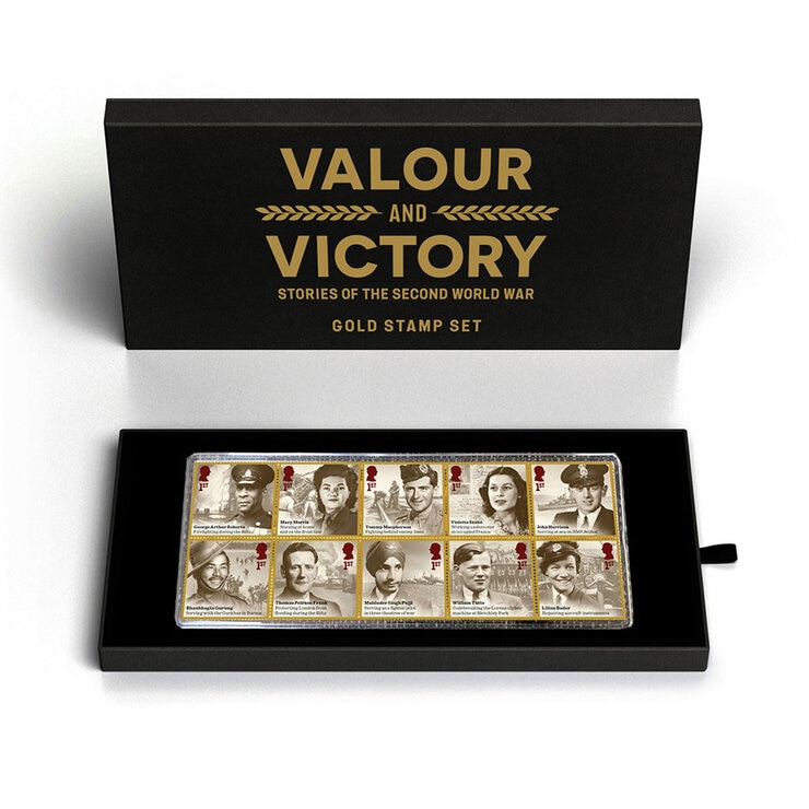 An exquisite, unique, limited edition set of Valour and Victory stamps produced in 24 carat gold. This exceptional collectible celebrates the extraordinary wartime roles played by ordinary men and women.
