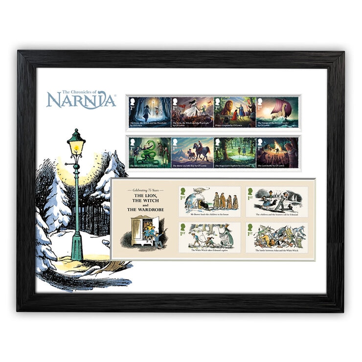 All 12 of The Chronicles of Narnia stamps mounted in a premium black frame.