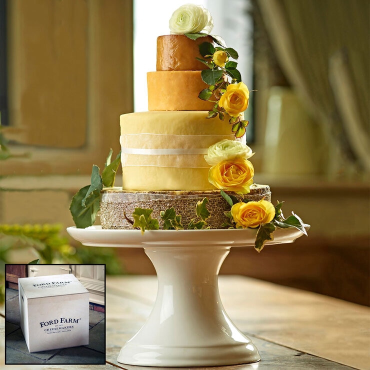 Though measuring only 25cm in height, the Litton Cheney layered cheese celebration cake made by Dorset dairy Ford Farm still packs a punch in terms of taste and impact at a wedding or special event.