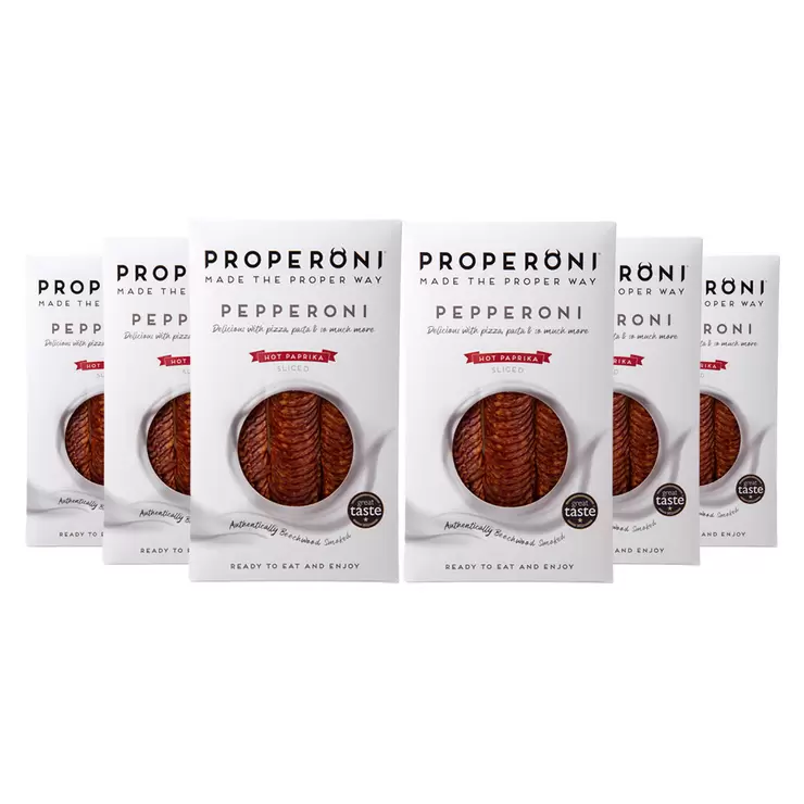 Traditionally beechwood smoked and naturally cured, Properoni is pepperoni made the proper way. Proudly Prepared in Gyula, Hungary, home to the world's finest pepperoni for over 150 years, Properoni has been the choice of the UK’s top restaurants and pizzerias since 1968. Made using six simple quality ingredients. Enjoy the taste of award winning Properoni at home.
