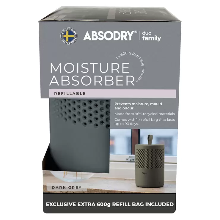 Absodry Duo Family Moisture Absorber blends nicely into any room of your home or at the workplace. With its Scandinavian design and minimalistic shape, it gives a modern and decorative expression. It works in silence and is easily emptied of water when the indicator shows full. It removes bad odours and reduces the smell in your home, as well as, quietly and methodically keeping the moisture at an appropriate level. The dark grey dehumidifier is delivered with 2 x 600g refill bags with moisture-absorbing crystals and each bag lasts 1 - 3 months depending on the humidity where it is placed. The special crystals in the bag absorb excess moisture in the surrounding air that condenses into water into the container and balances the humidity in its surroundings.