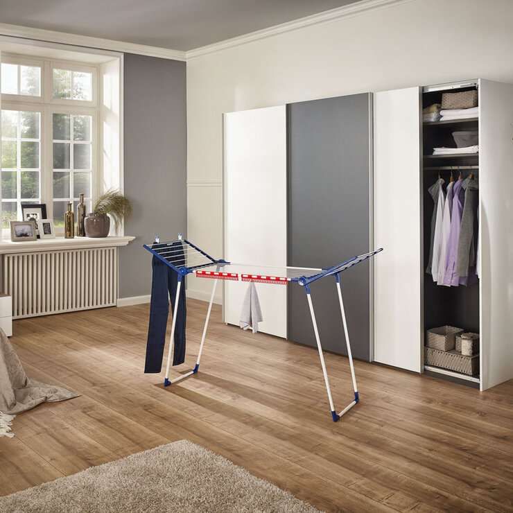 The Pegasus 150 Solid Slim Clothes Airer securely holds up to 15m /15 kg of washing. Its spacious size folds flat when not in use. The frame is sturdy and robust, coated with chip-resistant paint. Two parallel feet give it good stability. At only 55 cm wide, this folding clothes airer will fit through doorways and is compact enough to stand anywhere, such as in the hall or or on the balcony.