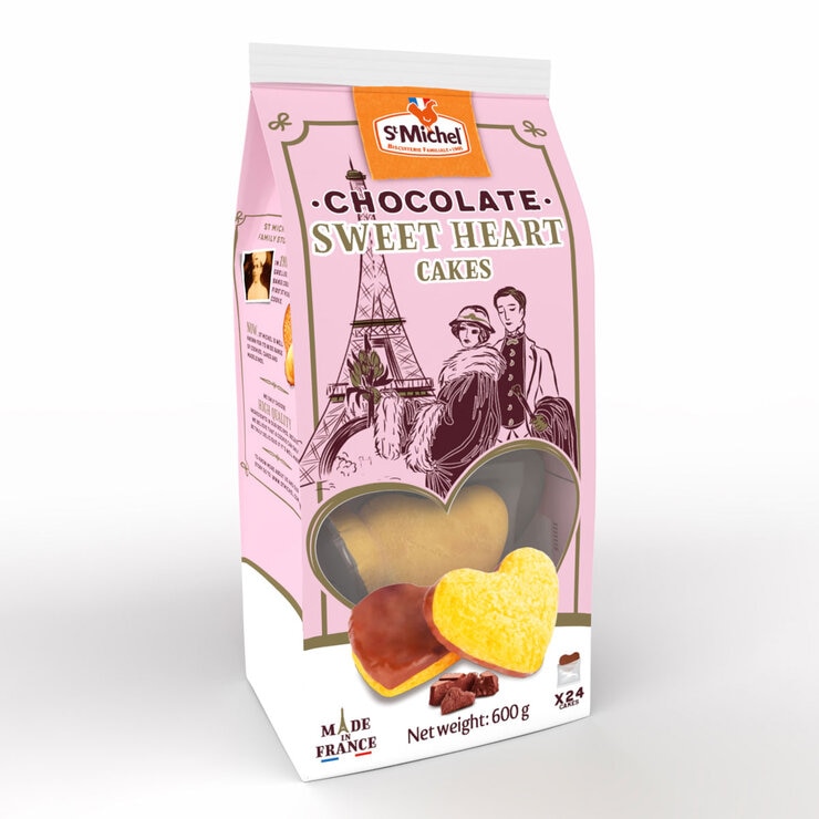 St Michel Milk Chocolate Sweetheart Cakes offer a deliciously soft vanilla flavoured cake crowned with a layer of milk chocolate, creating a heavenly combination that will transport you to a world of lightness. There is no colouring, no preservatives, no hydrogenated fat and no palm oil. To preserve the flavour and maintain the delicate softness, each sweetheart cake is individually wrapped. This ensures that every bite you take is as fresh and delightful as the first, preserving the quality you expect.