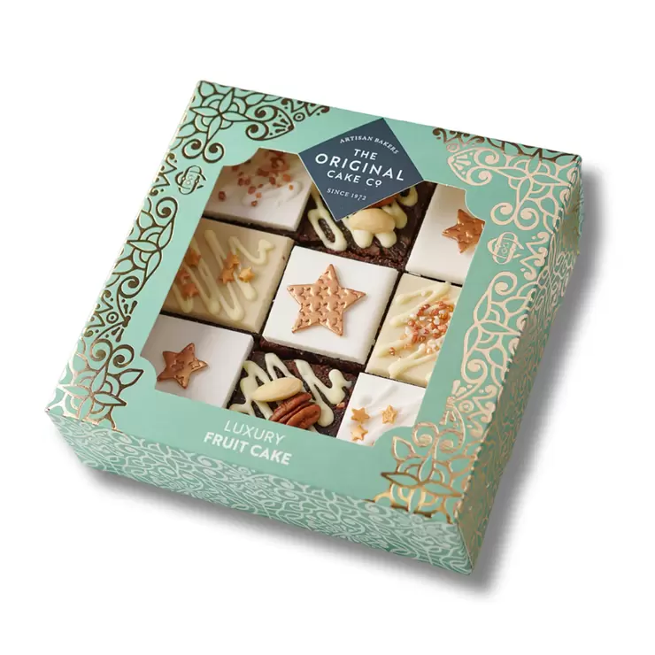 Each square is hand decorated with an assortment of marzipan, sugar icing, and white chocolate and finished with decorative sugar stars, walnuts, and almonds. This selection is perfect for sharing with family, or for gifting to friends who appreciate the classic flavours of the season! Treat yourself to a delightful taste of tradition with these exquisite fruit cakes, lovingly packaged in a beautiful windowed gift box, ideal for hampers, gifting, or sharing during the Christmas season.