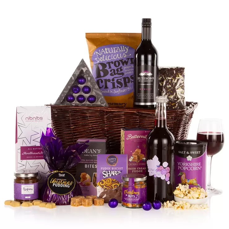 Our most popular choice as a corporate Christmas hamper, the Silent Night Basket makes a stunning gift for anyone who deserves something really special this festive season. A juicy bottle of Merlot is complemented by a deluxe Christmas Pudding, Chocolate Shards, savoury nibbles, fudge, popcorn, chocolates, crisps and a cake! So whether you’d like to say a generous ‘thank you’ to clients or colleagues, or surprise a family member or friend, there couldn’t be a better Christmas hamper choice. Also available in a decorative postal carton.