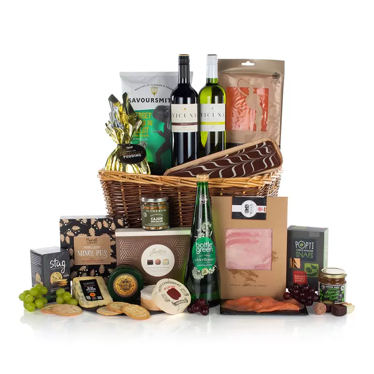 Lift the holiday spirits with the enchanting Spirit of Christmas hamper, perfect for sending season's greetings to colleagues, clients, or beloved family and friends. Nestled within an elegant wicker basket is a gastronomic parade of artisanal treats that promise to elevate Christmas festivities with each unveiled delight. This cornucopia of gourmet pleasures includes mouth-watering cheeses such as Graindorge Petit Camembert, Long Clawson Blue Stilton, and The Mouse House Finest Vintage English Cheddar. They sit alongside a traditional Maxwell & Franks Christmas Pudding and an assortment of refined Butlers Chocolate Truffles & Pralines, curating a harmonious blend of savoury and sweet. For an epicurean indulgence, the Dorset Cured Sliced Ham and Smoked Salmon are perfect with the tangy Otter Vale Apple Chutney. Add to that the crunch of Somerset Cheddar and Shallot Crisps and the fiery Olive, Garlic, and Chilli Snaps for a veritable feast. The hamper promises a sweet serenade with Mince Pies and a Tiffin Tray Bake, best enjoyed with the Cajun Spiced Chilli Nuts. A bottle of Malbec pairs wonderfully with the robust cheeses, while the Sauvignon Blanc offers a refreshing note alongside the smoked salmon. Round off the festivities with the Elderflower Sparkling Presse, a delightful non-alcoholic treat.