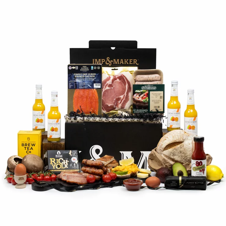 Based in the heart of Lincolnshire and proudly female-founded, IMP & MAKER delivers modern food and drink gifts made to be enjoyed now. Expertly curated, beautifully presented, and always delivered with care. Start the day the IMP & MAKER way with The Ultimate Family Breakfast Hamper - a luxurious collection of breakfast essentials made for relaxed weekends, special occasions, and generous gifting. From buttery sourdough and rich smoked salmon to golden-yolked eggs and real English tea, this hamper brings together the finest ingredients for a breakfast worth lingering over. You'll find Alfred Enderby Smoked Salmon, award-winning and traditionally cold-smoked for deep, silky flavour, alongside six Mountains Boston Sausages and thick-cut Mountains Dry Cured Back Bacon, both packed with local Lincolnshire character.