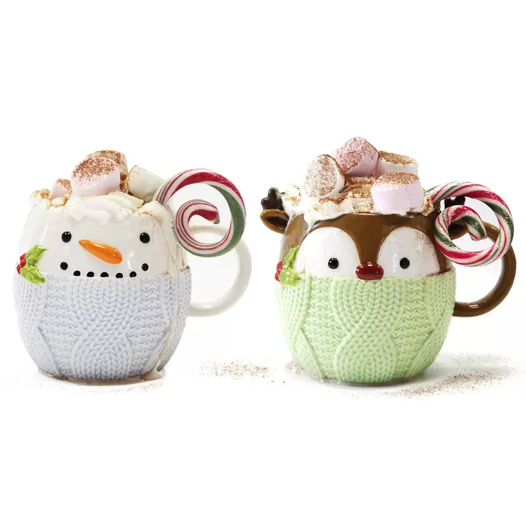 This festive Hot Chocolate Mug Set offers the perfect gift for hot chocolate lovers. Available in 2 designs, a snowman in a blue woven jumper with carrot for a nose and sprig of holly and a reindeer with a green woven jumper with a red nose, antlers and sprig of holly.