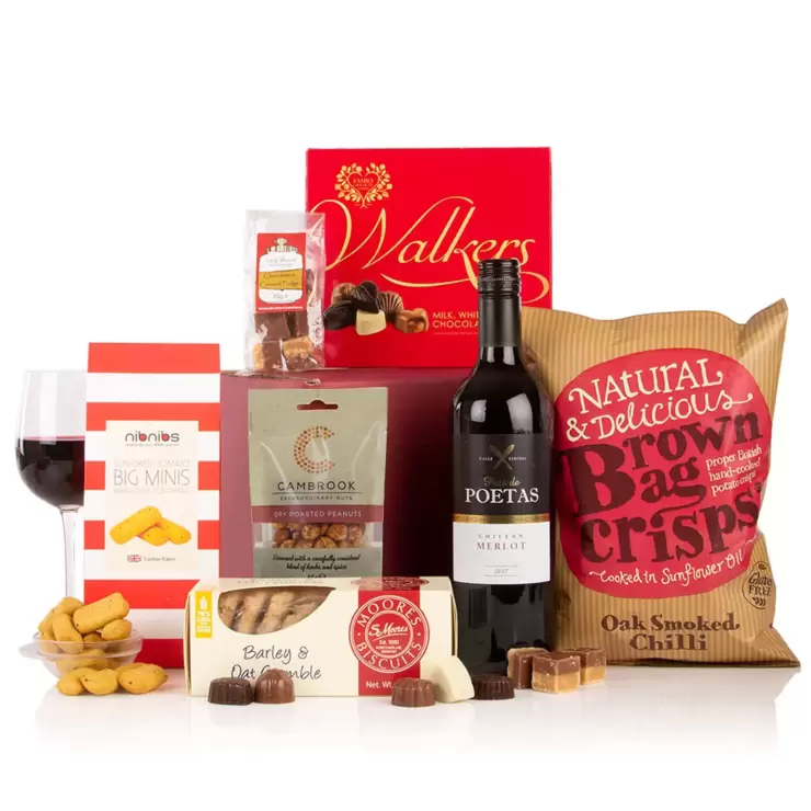 This hamper contains indulgent sweet and savoury treats, such as toffee popcorn and chocolates that are rich and moreish. With a bottle of Merlot added in, this postal carton is full of joy!