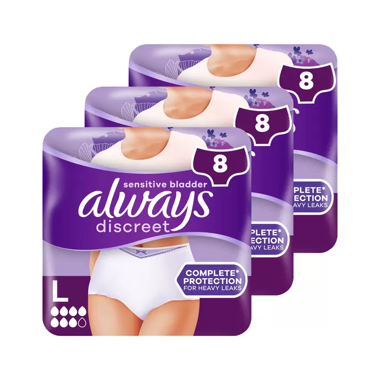 Bladder leaks shouldn’t hold you back. With Always Discreet Incontinence Underwear Plus L, you can continue with your day as normal, even when you experience large amounts of leaks caused by sudden urges. The super-absorbent underwear is dermatologically tested, soft on skin and has RapidDry technology to help lock away bladder leaks and odours in seconds. The Double LeakGuards help stop leaks where they happen most. With 360° FormFit shape and a comfortable design core for a smooth and comfortable fit, you’ll be able to walk with confidence. Try Always Discreet Incontinence for bladder weakness. Also suitable for post-partum incontinence.