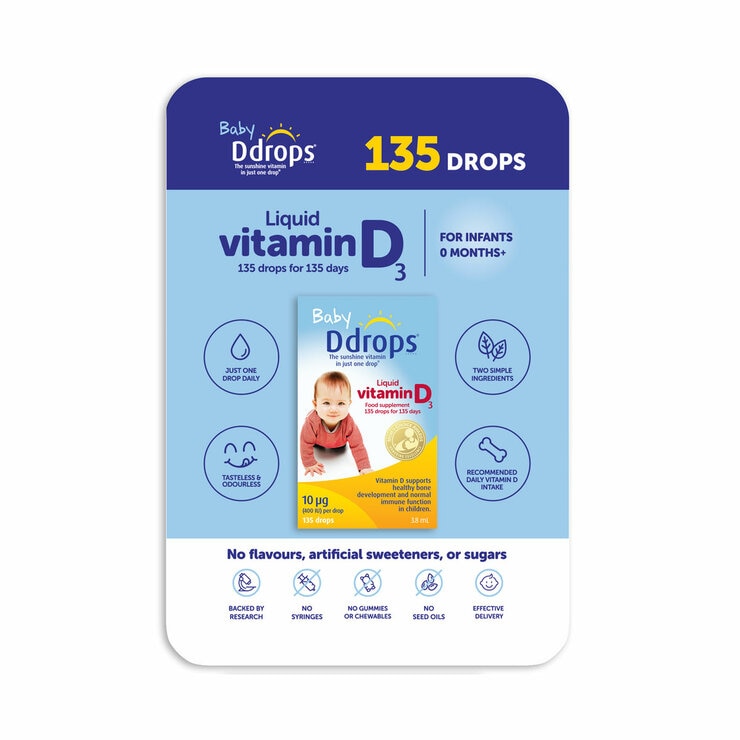 Baby Ddrops is a liquid vitamin D3 food supplement specifically designed for breastfed babies. 400 IU of purified vitamin D3. An easy and effective way for babies to get their daily vitamin D intake. Recommended daily 10 µg (400 IU) in just one tasteless drop. For infants and young children. Baby Ddrops contains no preservatives, no artificial flavours, no colouring.