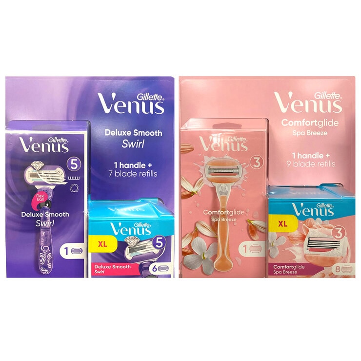 Venus Comfortglide Spa Breeze women's razors have 3 blades for a smooth, close shave. The razor blade refills come equipped with water activated gel bars that release body butters with a white tea fragrance, for glide and comfort. With a pivoting design that adjusts to your body's contours. Any Venus blade refill fits any Venus razor handle (Except Simply Venus and Venus Pubic Hair and skin).