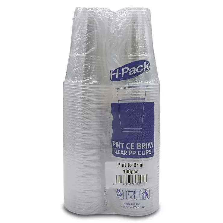 H-Pack Pint Tumblers 568ml, 100 Pack are CE marked clear plastic drinking cups with a capacity of 568ml per cup. Packaged in a plain polythelene wrap, these cups are ideal for use in office or catering settings and are specifically designed for cold drinks.