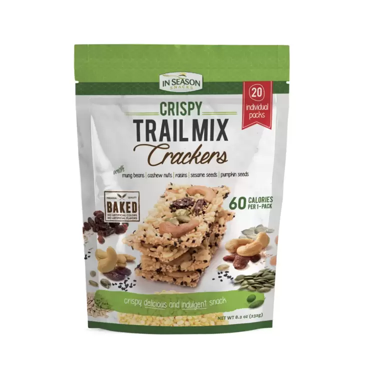 In Season Snacks Crispy Trail Mix Crackers are made with mung beans, cashew nuts, raisins, sesame seeds and pumpkin seeds. A crispy, delicious and indulgent snack.
