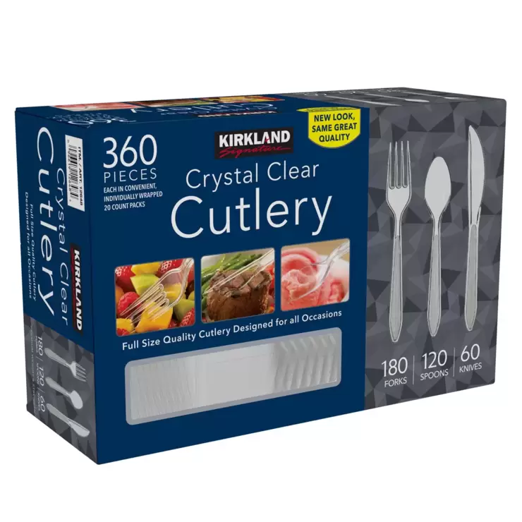 With a new, stronger design, this Kirkland Signature Crystal Clear Disposable Cutlery Set contains 360 premium weight pieces including: