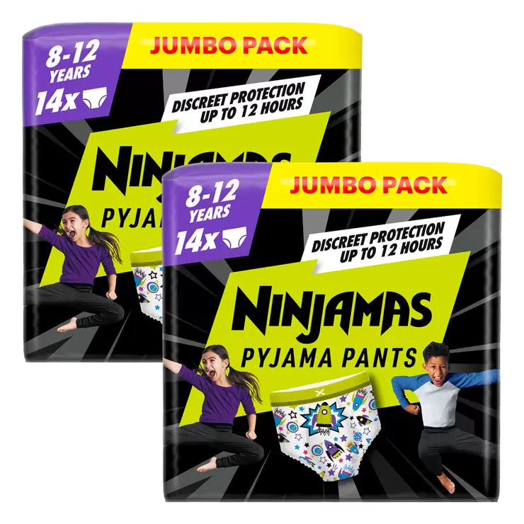 Introducing… Pamper Ninjamas Pyjamas Pants! Take on bedwetting accidents and wake up confident thanks to all-night leak protection. Ninjamas Instant Absorption Technology absorbs wetness instantly for powerful protection like you’ve never seen. Their 360° FormFit Belt adapts to your child’s waist for a discreet & comfortable underwear-like fit —so kids can wake up feeling great each day. Just like you, we put your child’s safety first: Pampers Ninjamas Pyjama Pants are dermatologically tested, free of EU perfume allergens (as regulated in the EU Cosmetics Regulation No 1223/2009), and certified by OEKO-TEX Standard 100.