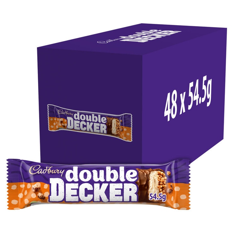 Cadbury Double Decker brings you a great combination of crispy rice pops with a smooth cocoa filling topped with soft chewy nougat. This is covered in a delicious layer of Cadbury milk chocolate, for a double deck of delights. Cadbury supports sustainably sourced cocoa.