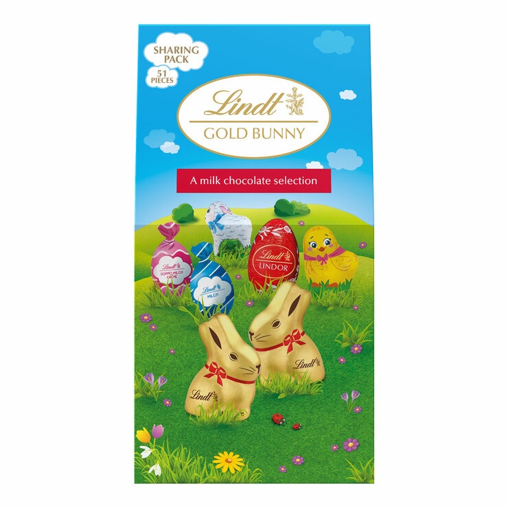 - Includes the Lindt Gold Bunny alongside various milk chocolate eggs and festive figures.