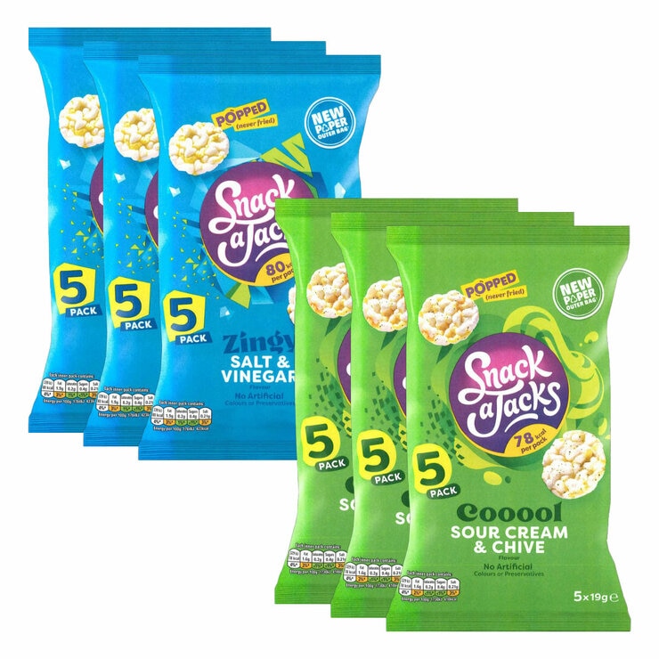 Snack a Jacks Salt & Vinegar & Sour Cream & Onion offer a delicious popped, low calorie snack, great for on-the-go or as a lunch box treat. These snacks are popped and never fried, each bag is under 80 calories and contains no artificial colours or preservatives.