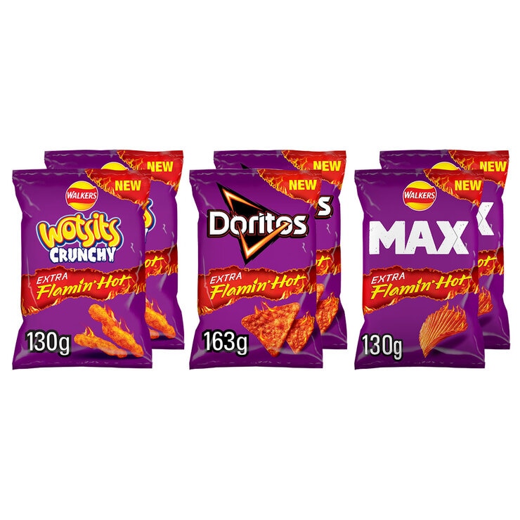 Walkers Flamin' Variety Box contains three varieties from the Walkers Extra Flamin' Hot range of snacks. Doritos Flamin' Hot combines the irresistible crunch of Doritos crisps, with the deliciously intense spicy flavour of Flamin' Hot! Walkers Max offers the irresistible deep ridged crisp bursting with intense flavour for the ultimate taste experience in every bite and Wotsits Crunchy is an irresistibly crunchy twist on the classic Wotsits you love.