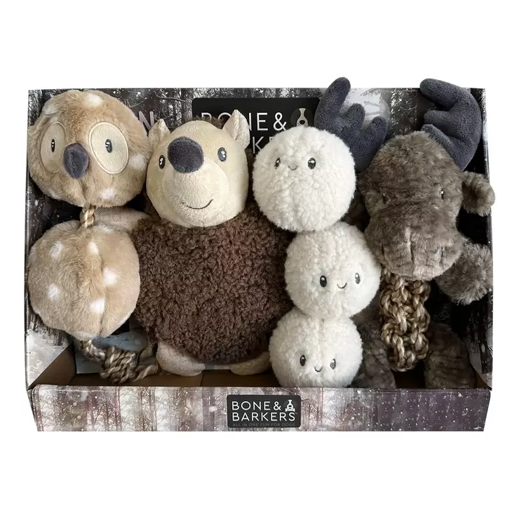Bone & Barkers Frozen Forest Dog Toys means your dog can unleash the joy of the winter season, designed to bring endless fun and engagement for your beloved pet. This enchanting collection features a delightful assortment of plush and squeaky toys inspired by the magical charm of a snowy forest.