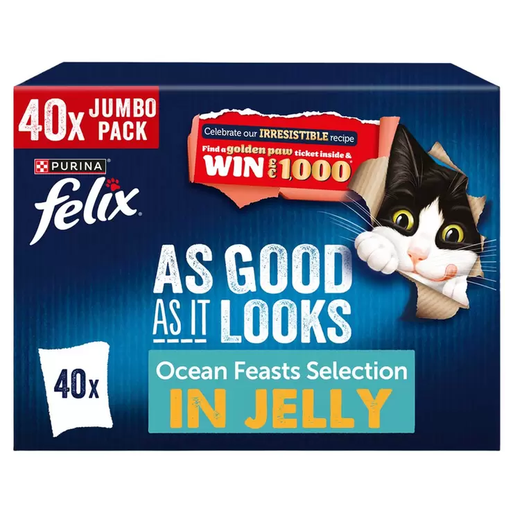 Felix As Good As It Looks Ocean Feast contains delicious flavours that your adult cat will enjoy and needs to stay healthy and active. Each recipe is specially prepared with tender pieces in a succulent jelly using high quality ingredients your cat will love. Flavours include cod, white plaice, salmon and tuna and will provide your cat with a varied diet, with a 100% complete and balanced nutrition they need to maintain a healthy and happy lifestyle. Felix use high quality, natural ingredients in the delicious recipes with Vitamins A & E and Omega 6 fatty acids.