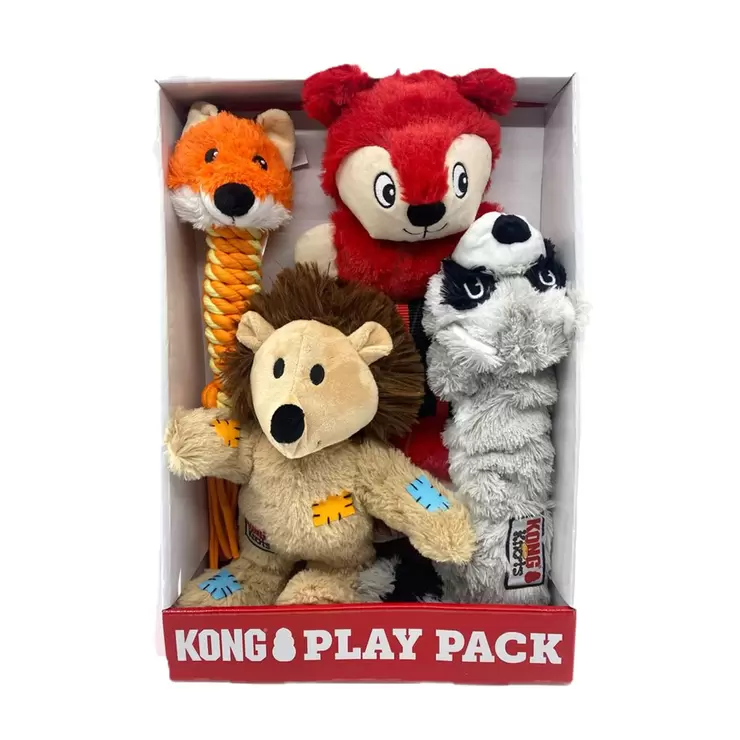 Kong Play Pack Dog Toys offers 4 unique woodland animals, with added squeaker and crinkle sounds for extra fun and knotted rope with minimal stuffing, meaning less mess!