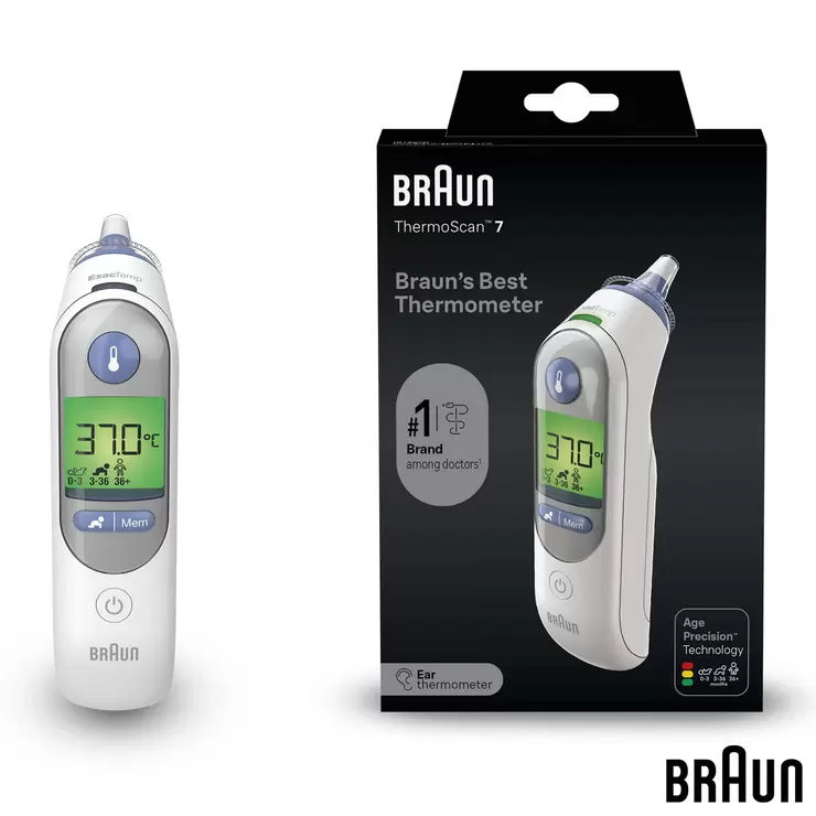 Get clinically validated accuracy from the #1 Brand among doctors. The Braun ThermoScan® 7 Ear thermometer makes temperature checks fast and easy. The Age Precision® Technology correctly interprets the measurement according to age (0-3 months, 3-36 months, or 36+ months) to give the most accurate results so that symptoms can be managed at home with confidence and the user-friendly ExacTemp® Stability Indicator confirms when the device is stable in the ear with a light and a beep. The device features a pre-warmed tip designed to be close to your body temperature for improved accuracy. It’s gentle enough for babies and easy to use on the entire family.