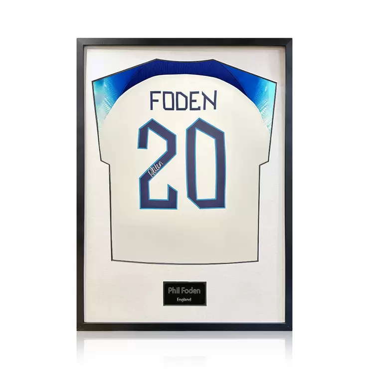 Phil Foden signed framed England football shirt, with black or white mount. This is an official England football shirt, which was personally signed by Phil Foden, at a private signing session with The Fan Cave Memorabilia.