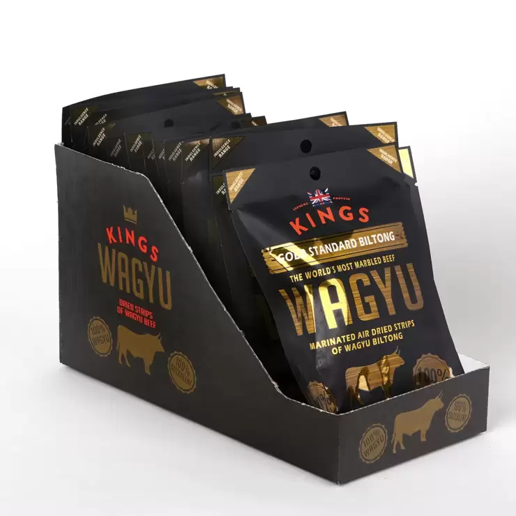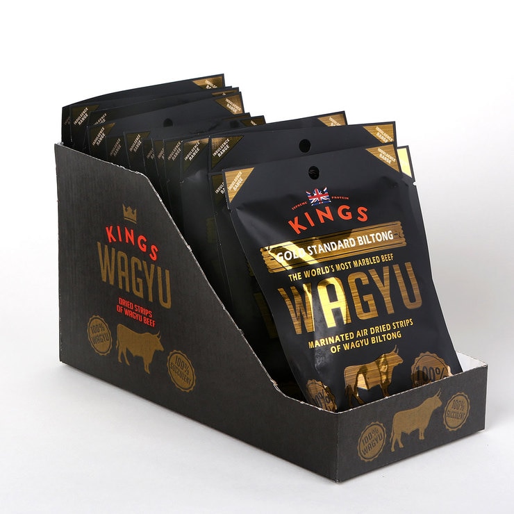 Kings wagyu beef biltong is part of Kings Elite Snacks's new indulgent range, which they claim are hands down the most delicious meat snacks they have ever produced. Wagyu beef is renowned for being incredibly marbled and extra tender.