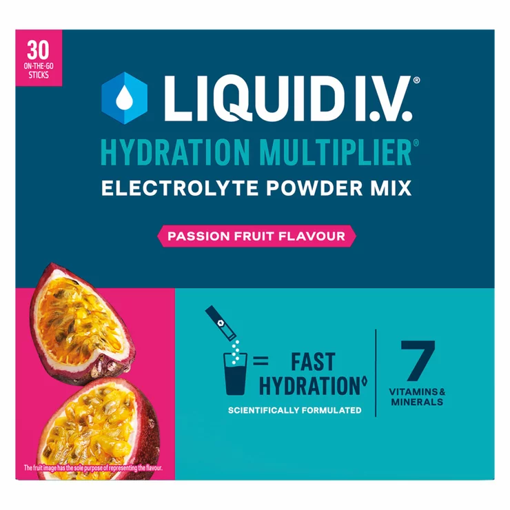 Liquid I.V.® Passionfruit Hydration Multiplier® Electrolyte Powder Mix helps maintain electrolyte balance lost through exercise, heat and travel. This Hydration Multiplier® Electrolyte Powder Mix contains 7 essential vitamins and minerals (B3, B5, B6, B12, C, sodium and potassium) and is also gluten-free. Liquid I.V.® Passionfruit Electrolyte Powder Mix rapidly replenishes electrolytes* and contains no artificial colours.