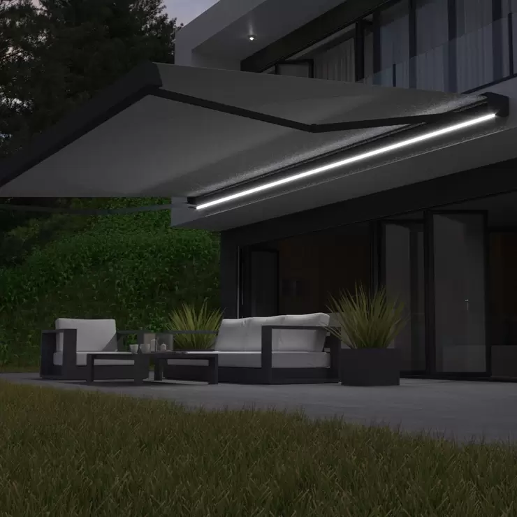 Introducing the Hera retractable patio awning with fitted dimmable LED lighting within the arms and cassette profile. Elevate your space with the unparalleled elegance and functionality of the Hera.