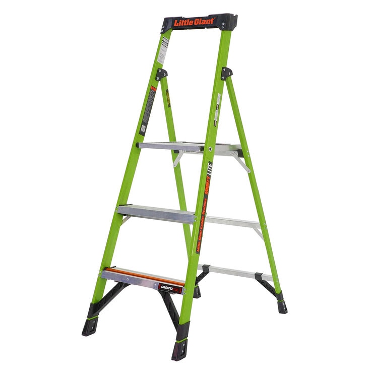 The Little Giant MightyLite™ Step Ladder is designed to help reduce or prevent the three leading types of ladder related injuries. Firstly, by reducing weight of the ladder, it reduces the likelihood of neck and shoulder pain from carrying heavy items around. Secondly, dangerous falls from standing on the top cap – the MightyLite™ comes with a large standing platform that provides additional comfort for users. Finally, each Little Giant MightyLite™ comes with the Ground Cue™ built in. This gives users an audible/sensory warning that the last step has been reached and it is safe to step off the ladder. The Little Giant MightyLite™ incorporates a multi-functional tool tray with non-conductive stiles, making them ideal for working around electricity. The combination of super-strong, C-section fibreglass stiles, and reinforced aluminium treads gives you a durable yet lightweight ladder that is perfect for the busy tradesperson.