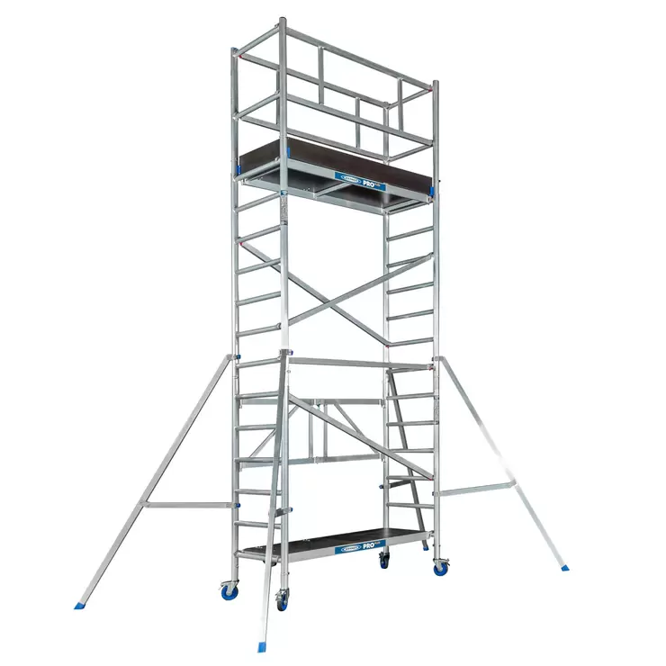 The platform stands at a height of 3.4 meters, providing a safe working height of up to 5.4 meters*, making it an ideal solution for professionals who require prolonged periods of elevated work. The design prioritises both safety and convenience, ensuring that users can perform their tasks without compromising stability or security.