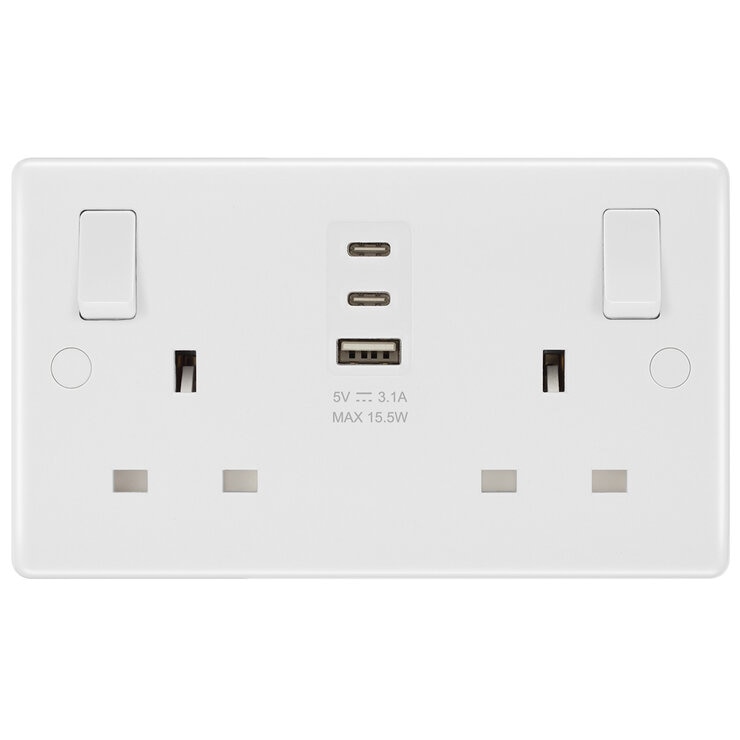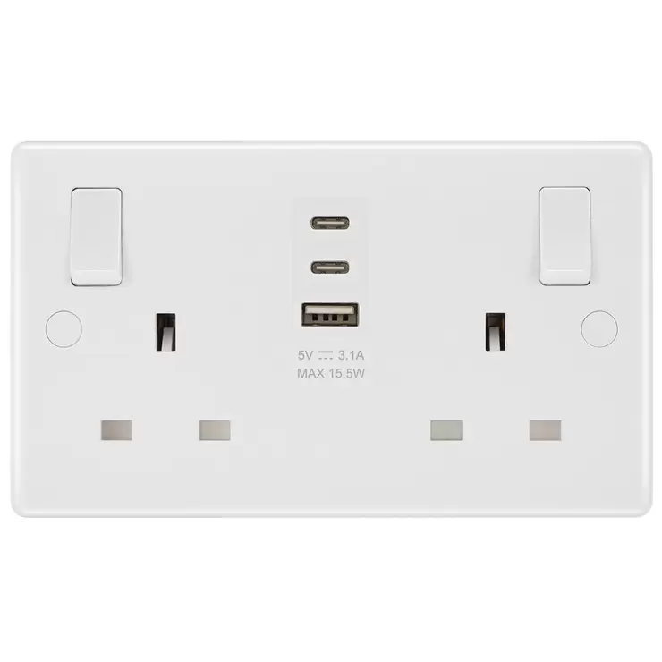 This pack of 2, Masterplug white moulded, 13A double sockets come with type A and 2 type C USB charging ports, allowing you to plug in an electrical device and charge mobile devices simultaneously without having to sacrifice a power socket.