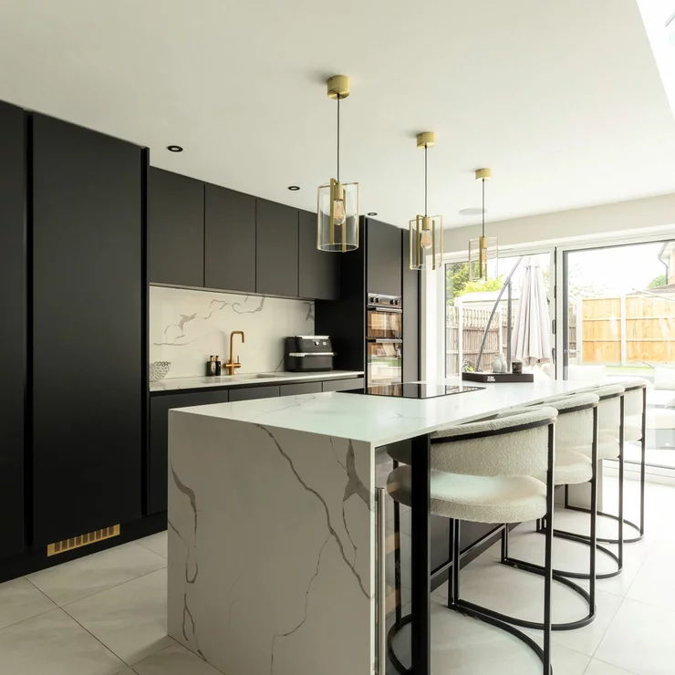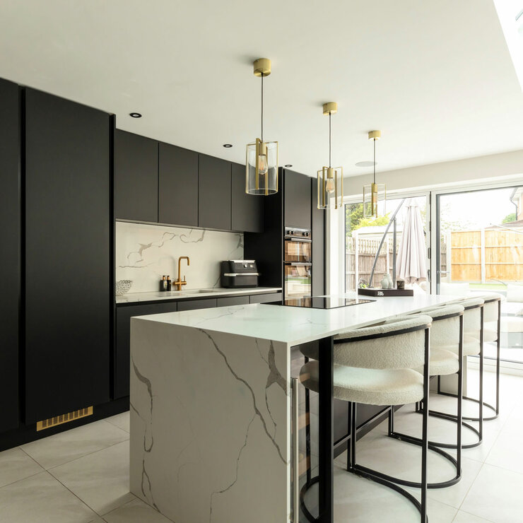 We work with oversized Quartz slabs and marble for seamless islands, tall splashbacks or full-height bathroom walls – perfect for modern, continuous design.