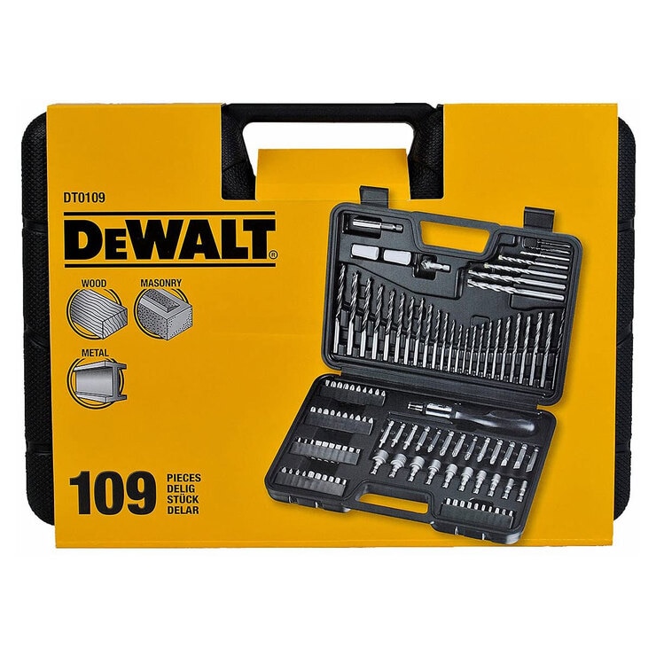 This DEWALT® drill & screwdriver bit set comes with 109 pieces and is intended for general purpose use. All pieces are compatible with standard chucks & hex chucks for screw driving & nut drivers, and organised in a convenient carry case.