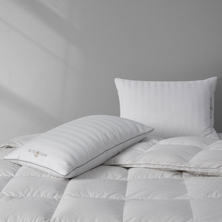The Hotel Grand Feather and Down Softy - Around pillow is filled with a natural blend of down and feather for comfort to conform to your head and neck. The beautiful 500 thread count damask stripe fabric in 100% cotton is a tightly woven pillow covering. The soft outer wrap of down alternative polyester makes it soft to the touch and creates this medium - firm pillow suitable for many sleeping positions.