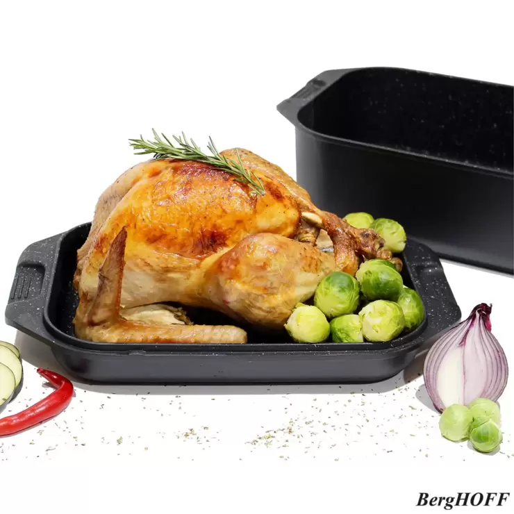The BergHOFF Eurocast Double Roasting Pan is a real multi-purpose tool that is essentially two pans in one. The grill pan lid can be used independently on the hob to grill meats, fish and vegetables to perfection. The generously sized base is designed for both hob and oven use and is ideal for soups, stews, casseroles and curries that you can start on the hob and transfer directly to the oven with or without the lid. The 2-layer ‘Ferno Ceramic’ non-stick surface, the newest layer from BergHOFF ensures quality, durability and performance whether using on the hob or in the oven.