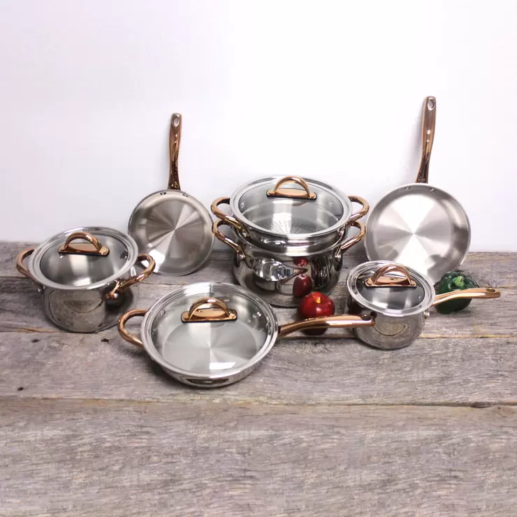 BergHOFF Ouro 11pc Stainless Steel Cookware Set with Rose Gold Handles & Glass Lids is designed for exceptional functionality and bold beauty. Featuring high-polish copper coated stainless steel accents and rose gold handles with ergonomic handles, this line was designed for optimal durability and cooking versatility. Constructed from durable 18/10 stainless steel, BergHOFF's cookware is built to withstand a lifetime of heavy use with a fast, simple cleanup. Ouro also comes induction-ready and guarantees the finest culinary experience.