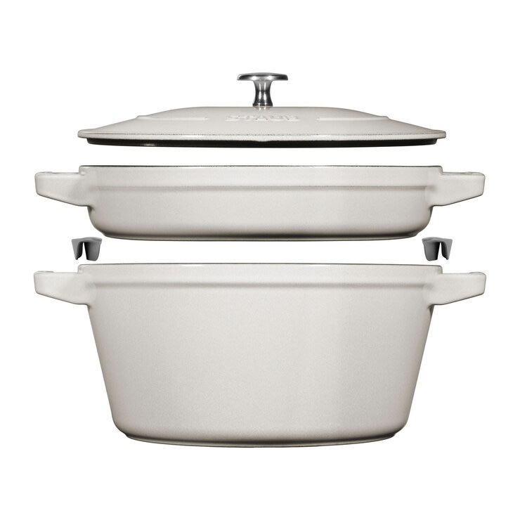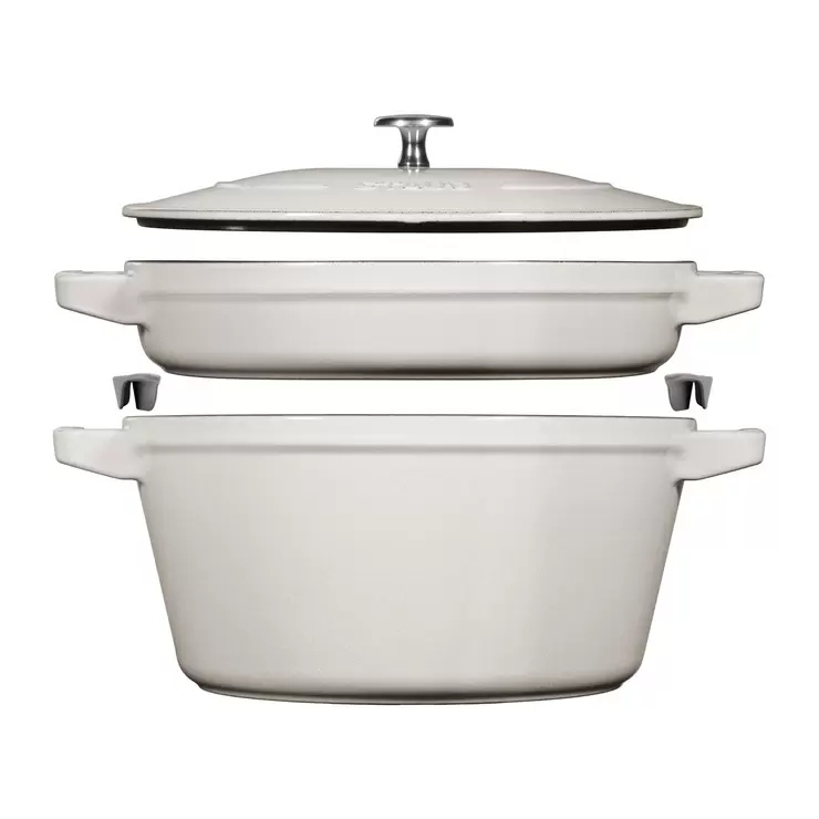 This 2 Piece STAUB stackable set consists of a cast iron frying pan and a cocotte with a matching lid. Together, they cover nearly all culinary requirements and can be used to cook a complete menu. The products are ideal for roasting, frying, searing, caramelising, steaming, boiling, blanching, slow-cooking and even baking. It is great for cooking whole meals for a family, for example frying meat, fish or vegetables in the frying pan and preparing rice or pasta in the Cocotte. Of course, all items can also go in the oven, where the Cocotte can show its strengths for braising or making casserole recipes.