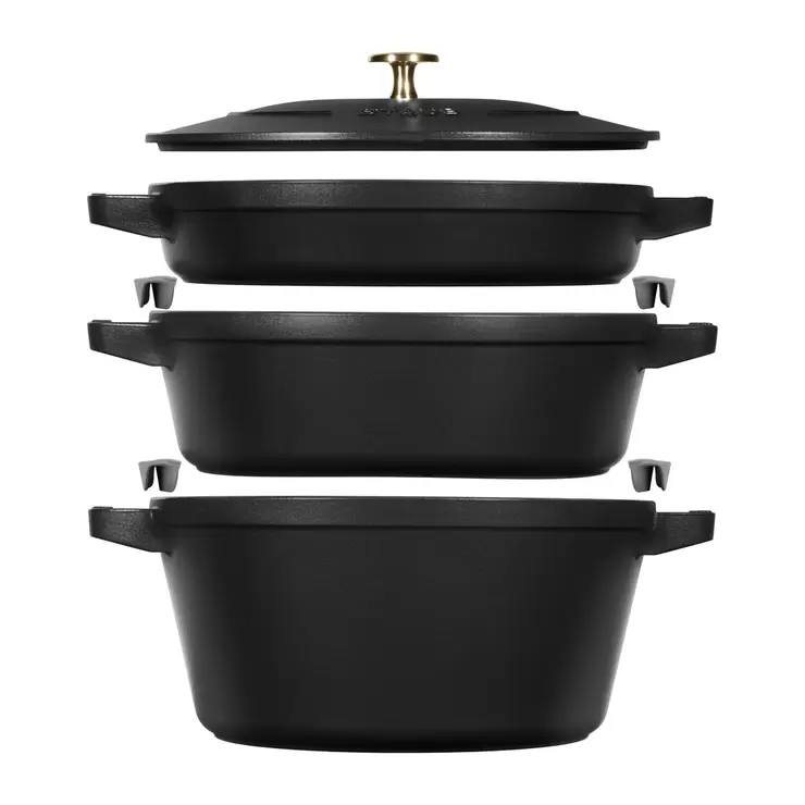 STAUB have put together a set consisting of a Cocotte, a braiser and a frying pan, complete with self-basting lid, that can be easily stacked and fits into every kitchen. With their 24cm diameter, the products have the perfect size for one-pot family meals or for individual dishes in a three-course dinner. Together, they cover nearly all culinary requirements and can be used to cook a complete menu. The products are ideal for roasting, braising, frying, searing, caramelising, steaming, boiling, blanching, slow-cooking and even baking.