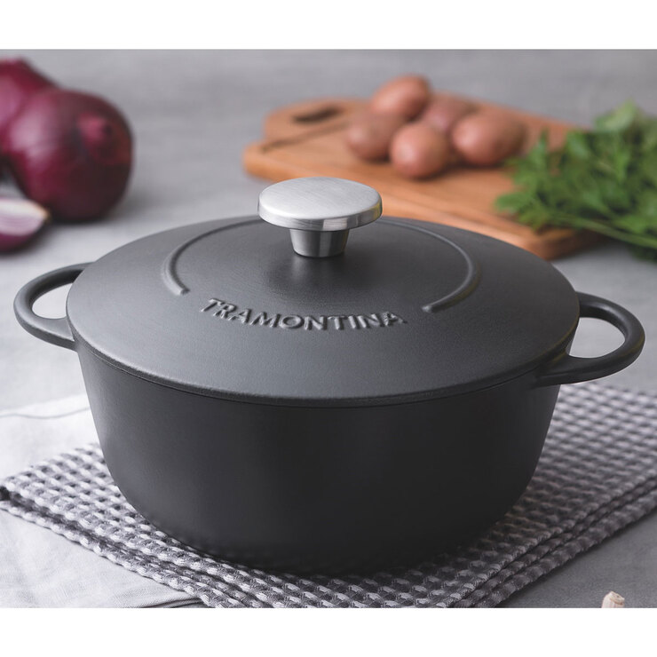 Tramontina 24cm Enamelled Cast Iron Casserole Dish features a black enamelled coating on the inside and the exterior, adding a special rustic touch to your kitchen. The brushed stainless steel knob on the lid offers a stylish element as well as a safe and comfortable grip. The cast iron construction guarantees fast, easy cooking as it distributes heat evenly and quickly throughout the pot.
