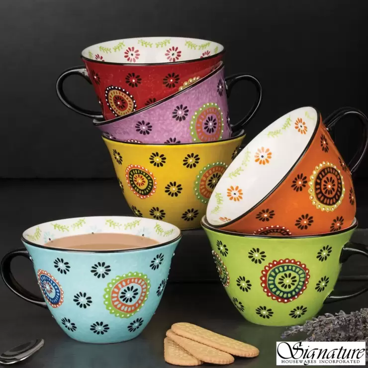 These Jumbo Ceramic Mugs are beautifully hand painted and decorated to brighten any day with colour and style. Made from durable stoneware, these mugs will offer years of function.