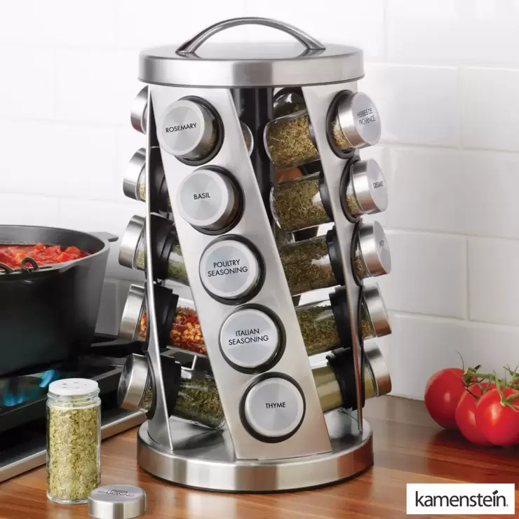 Kamenstein presents a smart, stylish solution for storing and selecting spices with this 20 Jar Revolving Spice Rack. The space-saving carousel design spins to keep the right herb or spice at your fingertips. The 20 see-through glass jars have sifter disks to control seasoning that can easily be removed for filling, pouring or using measuring spoons. The jar caps are clearly labelled for easy identification and the slide-in slots hold the jars securely when the rack is rotated.