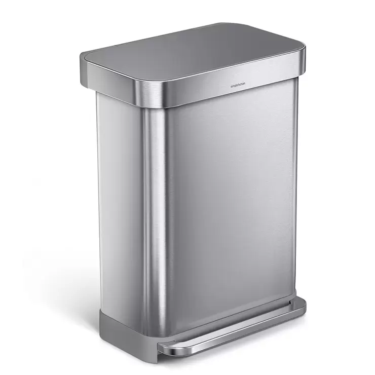 The simplehuman 55L Rectangular Step Bin has a stainless-steel liner rim that grips the liner and keeps it hidden. An innovative liner pocket stores and dispenses liners from inside the can for a faster liner change. Liner refill packs store easily in this can's liner pocket.