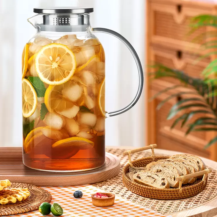 This glass pitcher comes with a dual opening 304 stainless steel lid, which can be adjusted as you like, making it easy to retain pulp and ice cubes or pour beverages quickly. With capacity 2.2L, this pitcher is large enough to meet your daily use. It's modern and delicate design made it perfect for holiday party.
